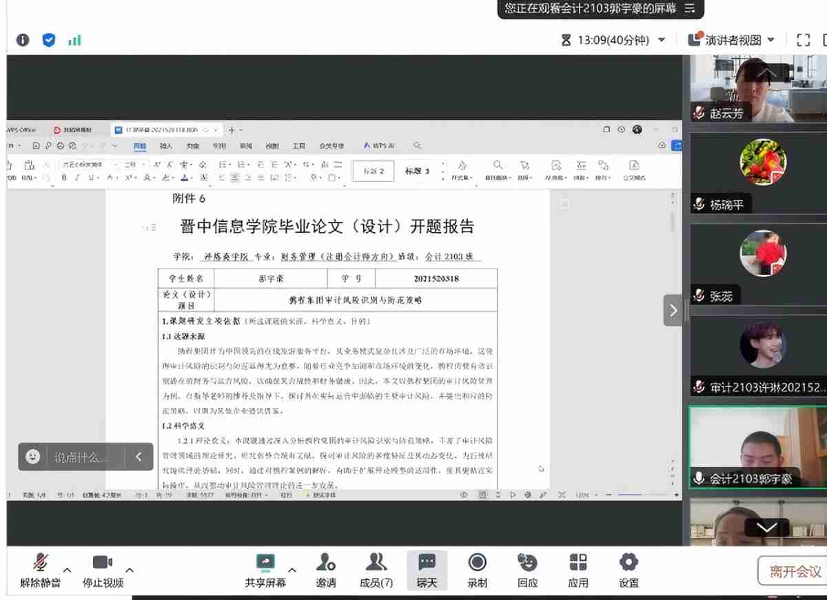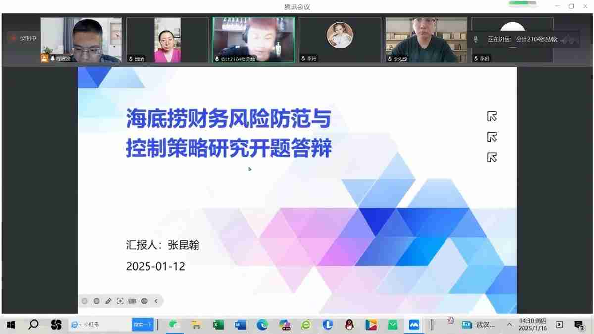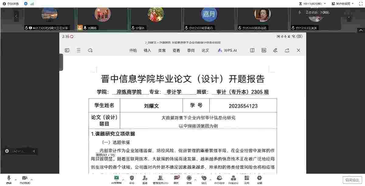 为提高本科毕业生论文质量,强化学生学术能力,2025年1月16日14:30,会计与审计教研室组织2025届财务管理(注册会计师方向)及审计学专业学生进行毕业论文线上开题答辩。本次答辩分三组同时进行,第一组:答辩组长:程建波,答辩组成员:郭婧、李超、李泓璇、李玲;第二组:答辩组长:刘翼旸,答辩组成员:宁强华、王金华、王一堃、辛艳;第三组:答辩组长:张君,答辩组成员:杨瑞平、张蕊、张若晨、赵云芳。开题答辩吸引众多师生参与。
