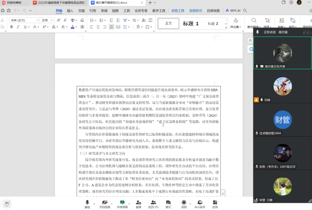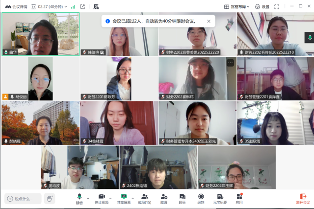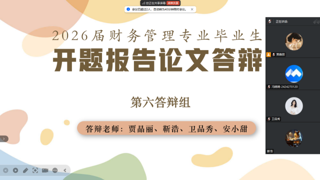 最后财务管理教研室主任史芳芳在总结中强调:“开题答辩是学术训练的关键起点,本次线上模式既保障了流程规范性,更通过云端录屏实现过程可回溯。后续将建立跟踪机制,确保论文全程质控”。