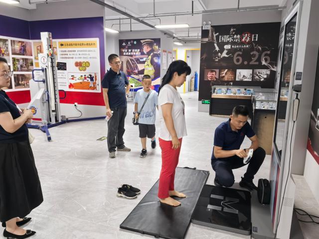 在专业工作人员的讲解下,现场老师体验仿真馆里人体测量仪、消防员训练专用跑步机、消防器材等真实的消防设备。杨瑞平教授与张蕊老师完整的体验了人体测量仪,程建波老师体验消防员专用跑步机、消防器材等,工作人员用现场的模拟道具人引导老师们练习急救方式,大家收获颇丰。