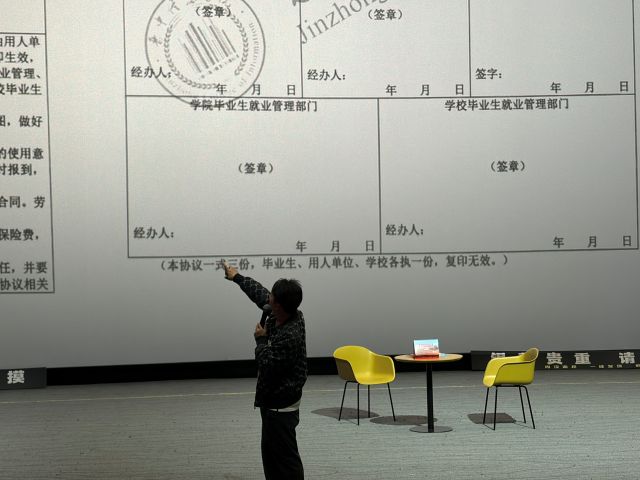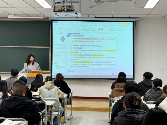 王军御老师系统讲解了就业、考试、心理、安全等相关政策与要求,为顺利毕业、平稳过渡提供了全面指引。介绍学校就业服务举措,包括“24365校园招聘服务”、基层项目、自主创业扶持等九大就业渠道。详解了智慧就业系统的使用流程、毕业去向分类登记规范,以及高质量就业认定标准与查询方式。