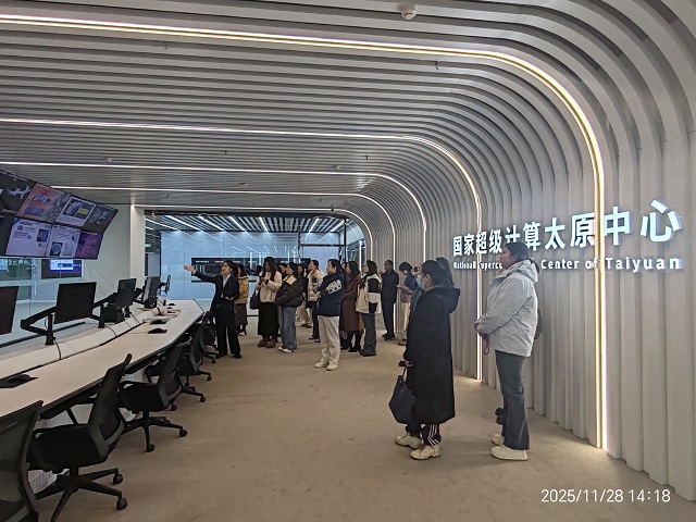 国家超级计算太原中心工作人员带领老师们进行参观并做了全面、生动的讲解。在中心展厅,老师们通过丰富的照片与视频、翔实数据及实物详细了解了该中心的建设背景、基本情况、发展方向以及国产计算机芯片的生产流程。在指挥调度中心,透过一块块大屏幕,老师们目睹了人工智能、高端装备、工业仿真、生命科学、生态环境、文物保护、地球科学等超级计算平台的实时运行状态,这些平台正支撑着包括AI智能教育——山西大学哲学大模型、中科院近代物理所中微子图谱研究、国产大型客机C929翼型优化、文物数字化保护等多个国家级、省级重点项目。
