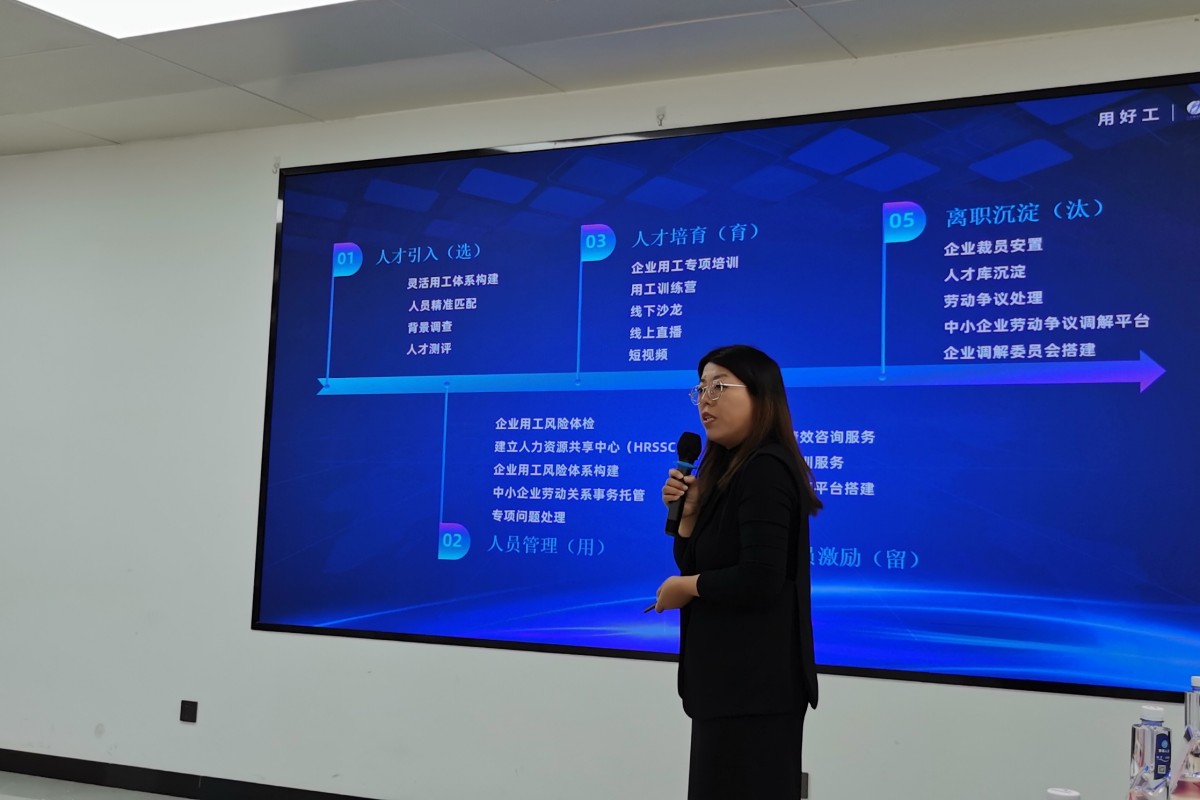 为展现企业在人力资源合规管理与数字化服务方面的专业能力,集团法务总监雷芳芳专题讲解并演示了企业核心创新产品——“用好工”企业用工全生命周期智能化合规风控引擎。该平台在用工风险管控、劳动关系事务托管、争议调解、用工模式设计及风险体检等方面的强大功能,给在场教师留下了深刻印象,也为探讨数字化背景下的人力资源管理教学改革提供了鲜活的案例参考。