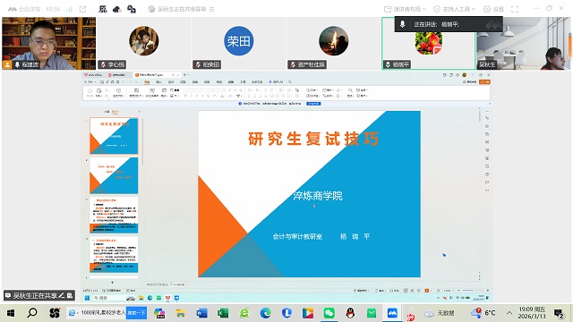 为帮助考研学子科学备战复试,掌握应试技巧,增强冲刺信心,3月13日晚,淬炼商学院邀请会计与审计教研室杨瑞平教授为备战考研复试的学子们带来了一场主题为“精准施策,从容应对——考研复试全攻略”的专题讲座与经验交流会。此次讲座在腾讯会议线上举行,吸引了众多即将参加考研复试的大四学生以及部分有考研意向的低年级同学到场聆听。