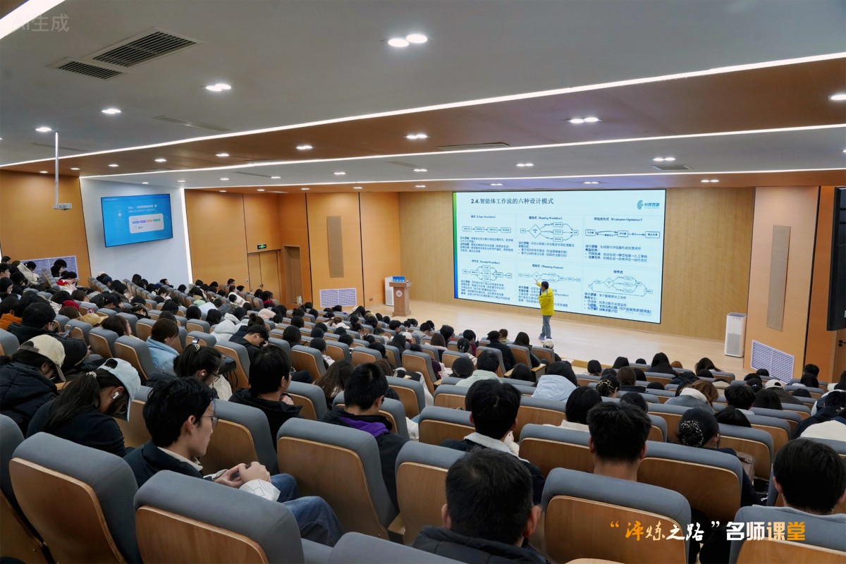 在系统解析“Agent是什么”这一核心概念时,王坚董事长从定义、工作流程、五大核心组件以及六种设计模式层层递进,构建起学生对智能体的完整认知框架。他特别强调了智能体工作流的六种设计模式,并重点与学生互动,举例剖析了“链式工作流”的原理与应用,引导同学们思考如何将复杂的业务任务拆解为AI可执行的序列化步骤,现场思维碰撞,气氛活跃。