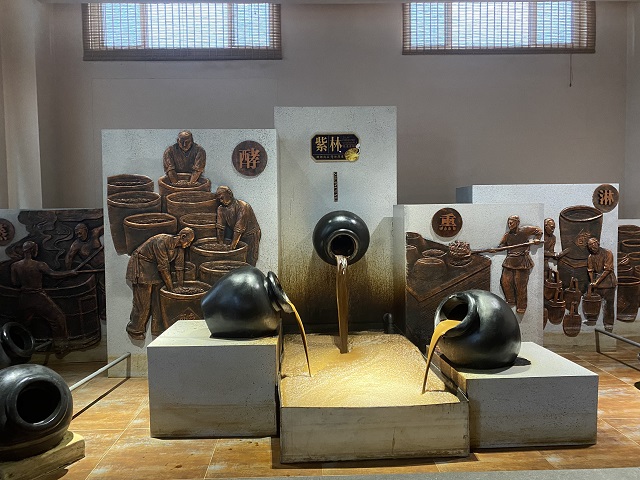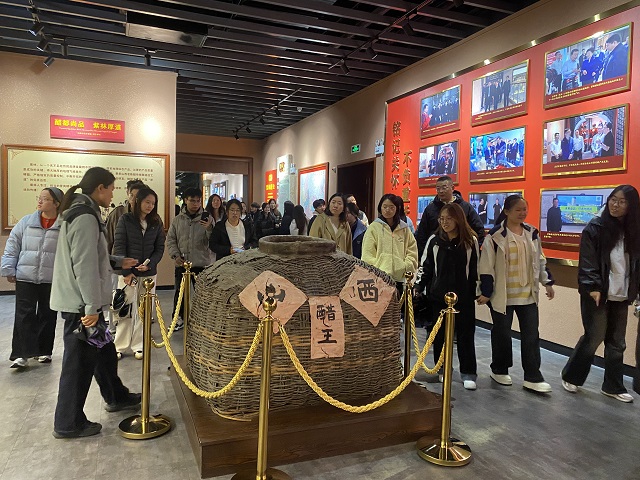 紫林醋工业园坐落于“中国醋都”清徐县,是山西老陈醋的发源地。师生一行首先参观了三晋醋苑主题展览馆,该馆建筑面积达3000平方米,通过序厅、世界醋史、贯中堂、紫林印象、醋乐汇五大篇章,系统展示了醋的历史文化底蕴。在制醋车间,学生们见证了传统工艺与现代技术的完美融合。醋酸发酵采用手工翻缸与机械化发酵相结合的方式,自主研发的翻醅机工作效率相当于30名工人,57米长的发酵池仅需半小时即可完成翻醅,彰显了工业化生产的巨大优势。陈酿车间展示了山西老陈醋“蒸、酵、熏、淋、陈”五大核心技艺。通过“夏伏晒、冬捞冰”的陈酿工艺,经过12个月以上的陈酿期,四斤原醋才得一斤成品,让学生们深刻体会到“愈陈愈香”的品质追求。