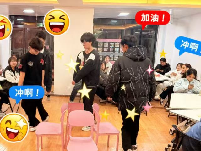 “加油!快坐下!”活动现场传来阵阵欢呼声,一场趣味十足的抢椅子游戏正在热烈进行,参与者在紧张又欢乐的氛围中释放活力,趣味抢椅子燃爆现场!镜头一转,可以看到贾烜同学故意放慢脚步,装作漫不经心,但到音乐尾声,他突然加速,左脚一扫,先把椅子勾到自己跟前,再一转身稳稳坐下,二郎腿一翘,还冲裁判比了个“OK ”的手势,嘴角藏不住得意,现场笑声与掌声不断。
