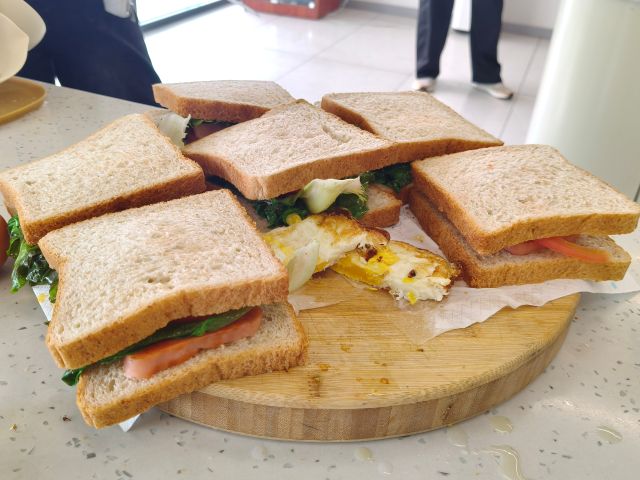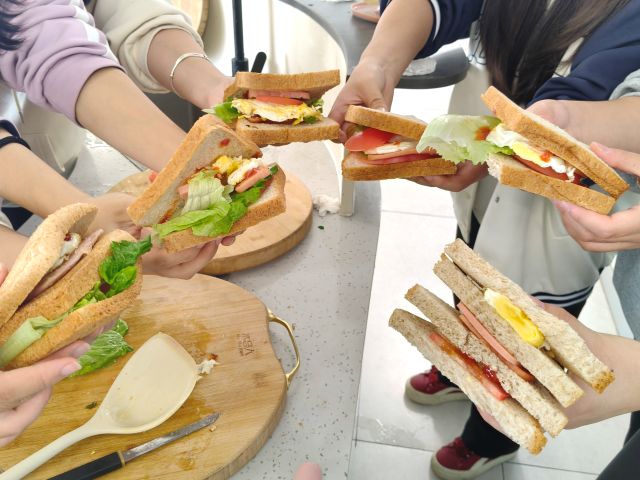 活动尾声,各小组将自己的得意之作一一展示在桌面上,五颜六色的三明治摆满了长桌,形成了一道靓丽的风景线。同学们纷纷拿起自己小组的作品,与其他小组相互品尝、交流心得。王同学笑着说:“平时很少做饭,这次和大家一起合作,从手忙脚乱到越来越熟练,特别有成就感。”大家一边津津有味地吃着,一边对彼此的创意和手艺赞不绝口,现场充满了欢声笑语。