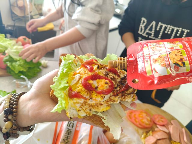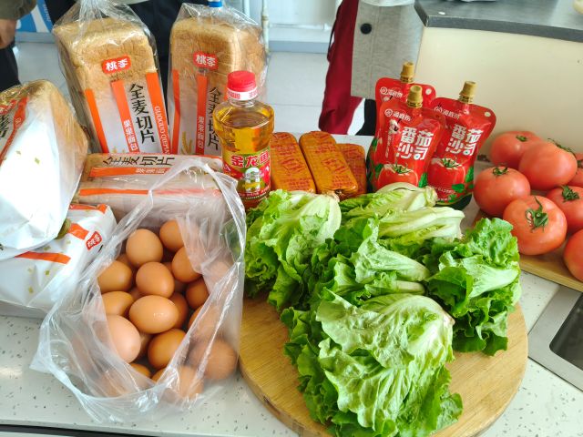 此次活动旨在通过新颖有趣的美食制作竞技形式,打破传统课堂的局限,让同学们在实践中感受劳动的价值与乐趣,同时进一步增强班级凝聚力。作为大二学生,班级同学正处于专业知识学习与综合能力培养的关键阶段,此类实践活动不仅有助于缓解学业压力,更能促进同学间的深度交流与思想碰撞。活动前期,班委团队经过多次讨论完善方案,精心采购了面包、火腿、生菜、鸡蛋、番茄酱等新鲜食材,并备齐刀具、一次性手套等工具,为活动的顺利开展提供了坚实保障。