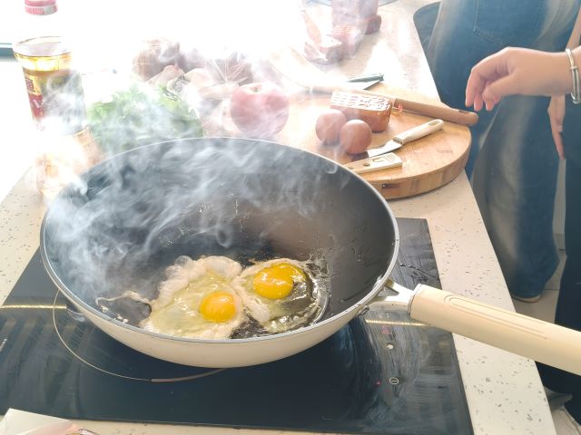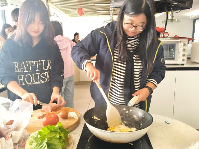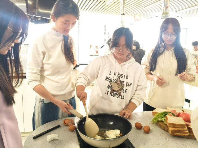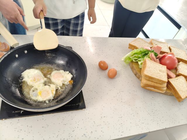 比赛开始的哨声一响,各小组便迅速进入状态,一场别开生面的“厨房竞技”就此展开。现场顿时忙碌起来,煎蛋的滋滋声、切火腿的笃笃声与同学们的欢声笑语交织在一起。各小组内部分工明确,配合默契:有的同学专注于煎制金黄的鸡蛋和火腿,小心翼翼地控制着火候;有的同学则仔细清洗生菜、番茄,认真地将它们切成均匀的片状;还有的同学负责涂抹番茄酱、组装三明治,力求每一步都精准到位。