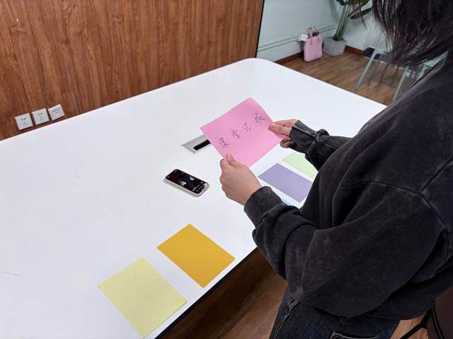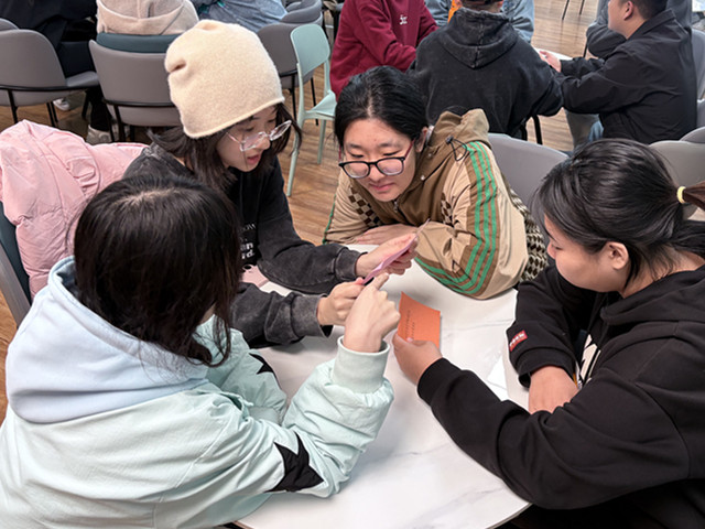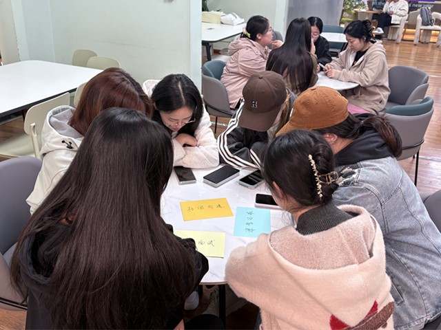 活动现场,学生们以小组为单位,围绕“课堂汇报”“面试模拟”“社团沟通”等职场与校园场景主题展开沉浸式演练。粉色便签纸上的“课堂汇报”主题,成为小组展示的起点——成员们手持卡片、围坐研讨,从内容逻辑到表达节奏逐一打磨;“面试”“社团沟通”等主题桌前,学生们模拟对话场景,在互动中锻炼应变与沟通技巧,现场时而传来思路碰撞的讨论声,时而因生动的模拟展示响起笑声。