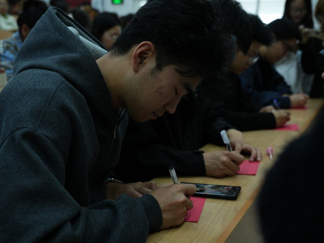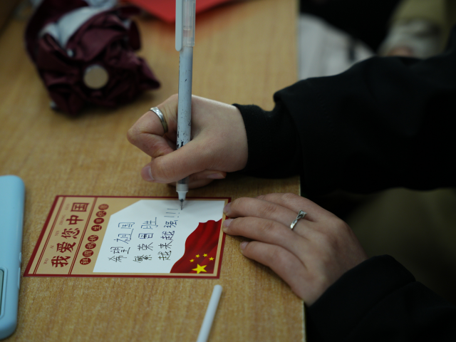 发布会的终章,是荣耀的“官宣”时刻。全体学子起立,以青春之名进行庄严宣誓——“用清澈的爱守护中国红,用奋斗的汗浇灌理想花!”这誓言,是他们与时代签下的“联名合约”。紧接着的 “爱国答卷”打卡 行动,则将合约条款具体化:学子们在迷你答卷卡上写下即刻的行动承诺——“要去了解一位芯片科学家的事迹,并讲给室友听”“要用消费支持来自帮扶县的农产品”“要在图书馆看完书后把椅子轻轻归位”。这些具体而微小的行动承诺,让联名合约有了真实的落点。当无数张答卷贴满“青春答‘国’墙”,每一个名字都在宣告:我们,就是这场伟大联名最闪耀的署名。这一刻,每一个名字都与“中国红”紧密相连,成为这场伟大联名中最闪耀、最不可替代的署名。