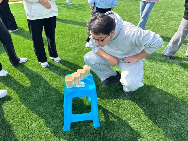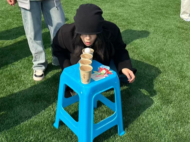 活动伊始,“纸杯传乒乓球”项目便挤满了人,参赛同学需在不借助手部力量的前提下,仅靠吹气,将乒乓球从一个纸杯传递至下一个纸杯,最终完成所有纸杯的传递。赛场上,同学们屏气凝神,眼神紧紧锁定在小小的乒乓球上,生怕一个疏忽就前功尽弃。围观的同学则围成一圈,时而因选手的精彩操作欢呼雀跃,时而因小小的失误发出惋惜的惊叹,现场氛围紧张又充满趣味。这个项目极大地考验了参与者的耐心、专注力以及对力度的把控能力,不少同学在反复尝试中摸索技巧,也在与队友的配合中加深了彼此的信任。