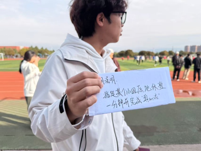 找到彩蛋还不算完,开出“任务卡”才是真挑战!有人获得换蛋万能卡,在众人羡慕的哀嚎中,笑着“洗劫”了隔壁小组的收获,上演了名副其实的“财富转移”,戏剧性拉满!还有人获得休息卡,带领全组休息一分钟,在全场忙碌穿梭的背景中,这组同学获得特许暂停,像被按下了慢放键,成为激烈赛程中一个可爱的反差画面。