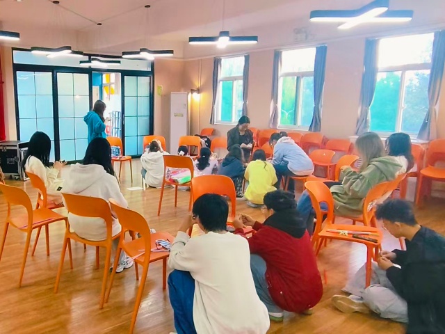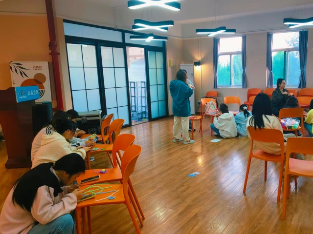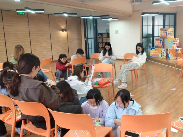 讲解结束后,同学们以4-5人为一组自由组队,迅速投入创作。有的小组分工明确:有人负责构思造型,有人专注扭制细节,有人搭配配色方案;有的小组则现场“头脑风暴”,从“校园风景”“卡通形象”“节日元素”中汲取灵感,将扭扭棒扭成可爱的兔子、精致的玫瑰、灵动的小台灯,甚至还原出无边书院的标志性建筑轮廓。创作过程中,负责人员穿梭在各小组间,耐心解答“如何让造型更立体”“怎样避免扭棒松散”等问题,现场不时传来“这个配色太好看了”“我们的兔子耳朵再弯一点会更萌”的交流声,欢声笑语不断。