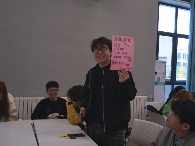 小组讨论环节聚焦恋爱核心议题,引发同学们热烈讨论。在“恋爱关系中应以什么为主”的讨论中,同学们结合自身经历各抒己见。多数同学认为,学业与自我成长应是最主要的,健康的感情能成为彼此进步的动力;也有同学提到,消费需量力而行,过度注重物质可能会冲淡情感,“共同规划而非盲目攀比”成为共识。谈及“有感觉到确认关系间最重要的特质”,大家的观点高度集中。“卡颜”“卡钱”“卡身高”等观点契合00后的择偶标准。责任意识、情绪稳定与价值观契合也被频繁提及,张晓璇同学分享道:“比起浪漫,更看重对方能否坦诚沟通、相互尊重。”