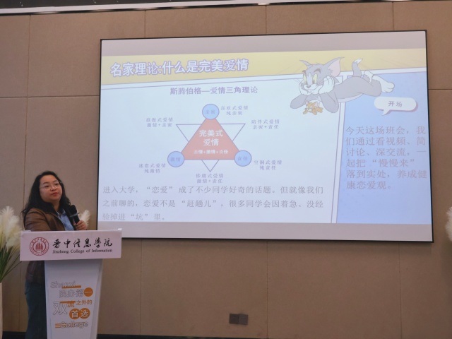 此次辅导员说完满以“年轻人爱的定义”为切入点,徐爽老师对比80后、90后、00后对爱情的不同关注点,结合斯腾伯格“爱情三角理论”,解析“完美式爱情”需兼具亲密、激情与责任的核心要素。针对大学生恋爱中常见的“讨好式恋爱”“闪恋迷茫”“学业受影响”等问题,她通过真实案例警示学生避开情感“陷阱”,并组织分组讨论,引导学生围绕“正常恋爱的底线”“确定关系前需了解的核心特质”展开深度交流,让学生在思想碰撞中明确情感边界。