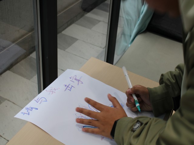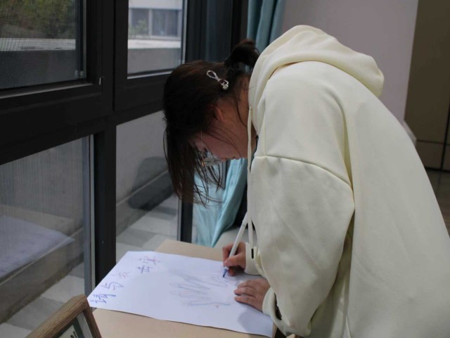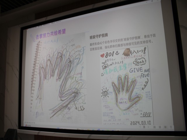 此次“请与我击掌”,以手掌为载体,以传递为路径,让同学们在创作与互动中打破了心与心的隔阂。同学们在纸上写下活动名称,勾勒出独特的击掌形状,以笔为刃,细致描摹出属于自己的心灵印章,每一副“掌印初胚”都蕴含着独特的个人风格。大家自由发挥,或书写成长愿景,或留下彼此鼓舞的话语。