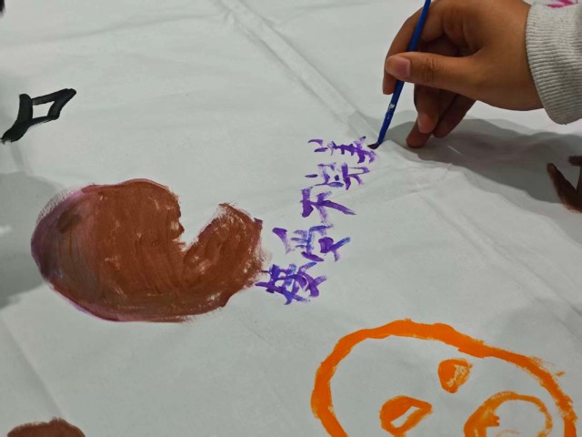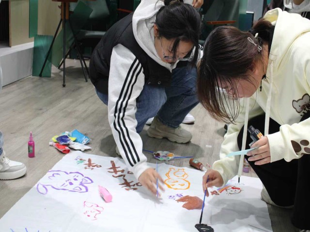 “心情的彩翼”环节为同学们开辟了情绪表达的艺术天地。主持人发放颜料和布料,同学们在创作中随性挥洒,以色彩和图案绘画抒发内心情绪。没有技巧的评判,只遵循“画布不会评判你”的理念,大家可以完全自由地表达。