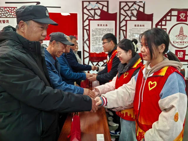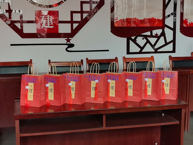 踏着故事分享的余音,激昂熟悉的旋律随即响起。老党员化身指挥,唱响《没有共产党没有新中国》和《我和我的祖国》。当唱到“我和我亲爱的祖国一刻也不能分割”时,所有人双手高高举起,面朝国旗,致以最高的敬意。随后志愿者有序为每一位老党员送上了精心准备的暖心礼品。艾草泡脚包,冬日暖贴——这份小小的礼物,不仅驱寒暖身,还可以缓解疲劳,辅助调理身体,更承载着后辈们深深的敬意与美好的祝福。