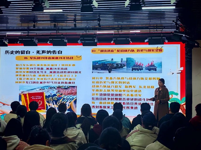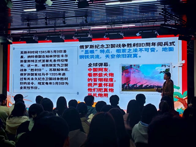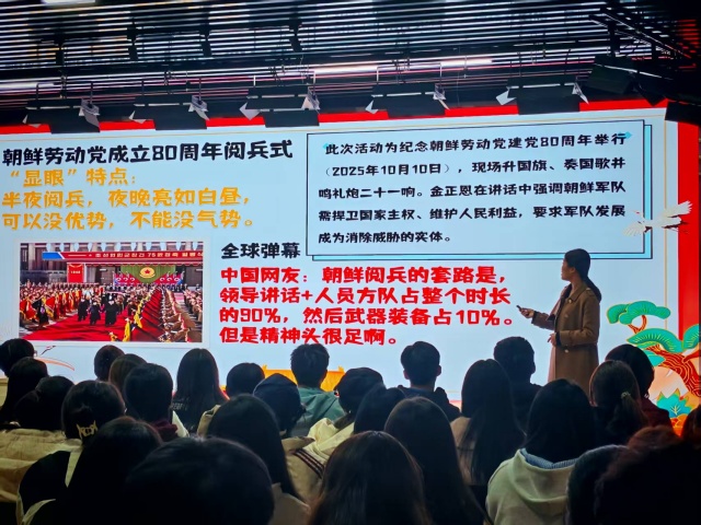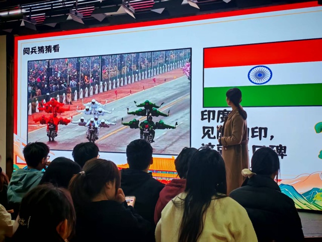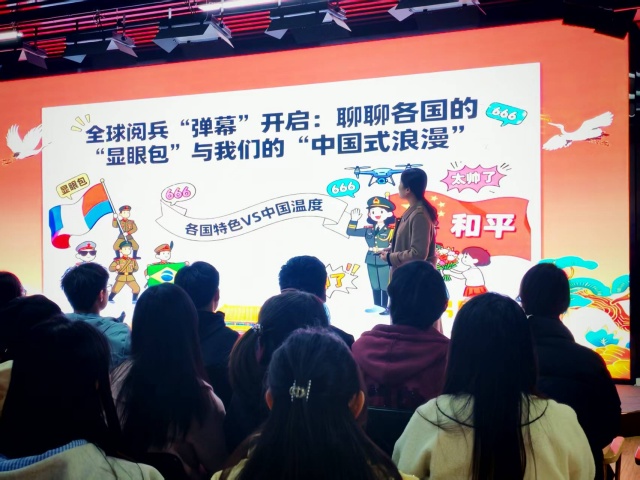 活动以“阅兵猜猜看”拉开序幕,带领同学们环游全球阅兵场。当朝鲜的热情、俄罗斯的硬核、印度的摩托杂技、美国的随性、英法的复古马术方阵等画面接连呈现,同学们用风趣幽默的语言精准捕捉各国特色,在轻松愉快的互动中,完成了一场对世界阅兵文化的直观解读。