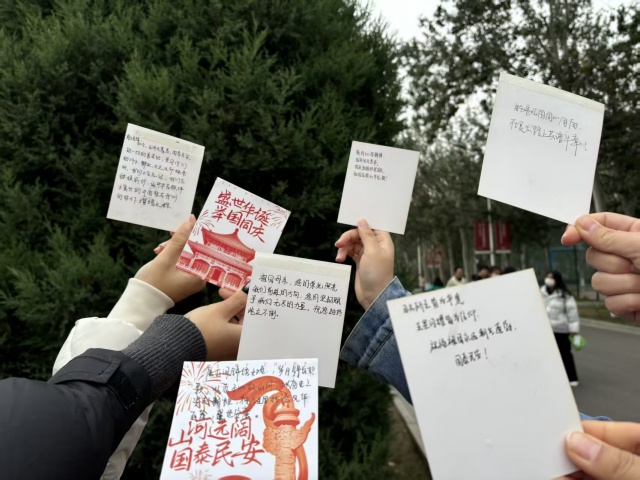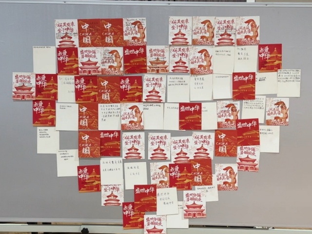 活动尾声,同学们齐唱《歌唱祖国》,激昂的旋律汇聚了所有“中国式浪漫”的片段,也将对祖国的热爱与自豪,激荡在每一颗心中。歌声渐落,同学们又纷纷在贺卡上郑重写下祝愿,让澎湃于心的热爱与自豪在笔尖流淌,现场多位同学主动起身分享祝福,“山河壮丽,岁月峥嵘,祖国长春,繁荣昌盛”等真挚话语,道出了少年们对祖国的深切热爱。这场活动让同学们深刻认识到,阅兵不仅是军事力量的展示,更是一个国家精神与文化的缩影。在列国阅兵特色与中国式浪漫的对比中,同学们为祖国的强大而自豪骄傲,也将带着振奋精神迈向新未来。
