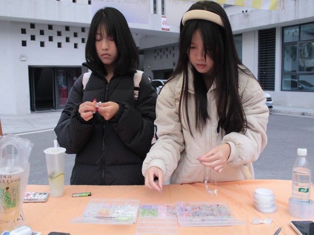 把喜欢的颜色,编进能随身携带的时光里。多巴胺手绳DIY区毫无疑问成为全场的人气担当!五彩斑斓的绳线在同学们灵巧的指尖穿梭飞舞,各式字母珠子与可爱挂件点缀其间,每一根绳线的缠绕、每一颗珠子的串联,都在勾勒独一无二的幸运手环。围坐桌前的身影各有专注,初学的同学紧盯志愿者的示范动作,指尖跟着慢动作起落,从生疏地绕线到逐渐掌握节奏,每一步都藏着对“亲手创造”的郑重;熟稔技巧的同学则带着巧思创作,先将刻有名字首字母的珠子稳稳穿入绳中,再细心挂上小巧铃铛,抬手晃动时,清脆声响里满是对个性表达的雀跃。更贴心的是,只要凭一枚活动特制的铜色纪念币,就能免费带走自己亲手制作的手绳,让这份快乐有了专属“信物”。