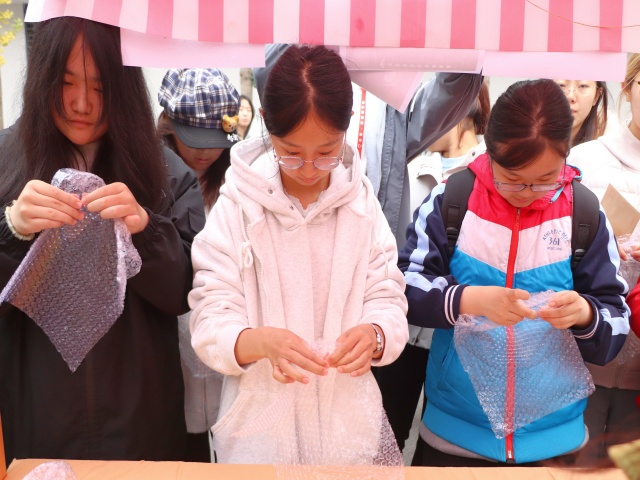“听过压力‘碎掉’的声音吗?是指尖与泡泡纸相拥的脆响。”解压捏捏乐挑战赛的现场,连片的“咔嚓——砰”声裹着笑意飘满角落。桌面上,印着浅蓝条纹、缀着小碎花的泡泡纸叠得整齐,等着被同学们解锁。拇指狠狠按压、指尖逐个捏破、双手齐动让脆响连成串……同学们蹙着的眉头悄悄舒展开,眼底渐渐升起轻松的笑意,满场都是把压力“捏跑”的鲜活劲儿。
