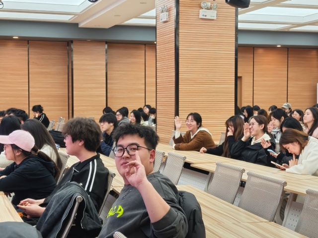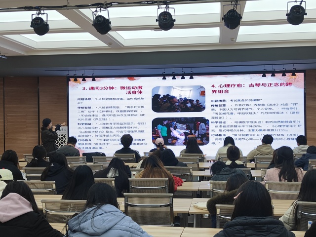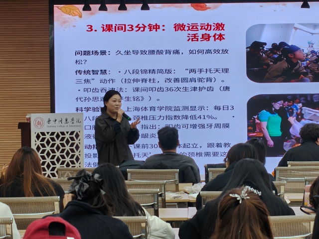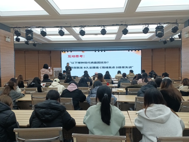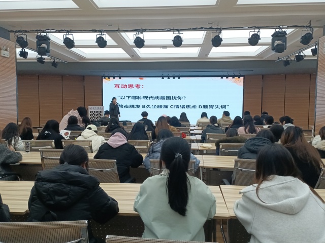 在互动探讨环节,现场通过大屏幕对比展示了食疗、八段锦等传统养生方式与健身、冥想等现代养生模式。传统养生方式历史悠久,蕴含着深厚的文化底蕴;而现代养生模式则更注重科学性和便捷性。随后,组织了“你更倾向哪种养生方式”的热烈讨论,同学们各抒己见,气氛活跃。宿宇老师适时指出年轻人中普遍存在的“朋克养生”认知误区,如一边熬夜一边喝枸杞茶,一边吃外卖一边服保健品等。现场还通过互动问答的方式,纠正了23项常见养生偏差,让同学们对养生有了更科学、更全面的认识。
