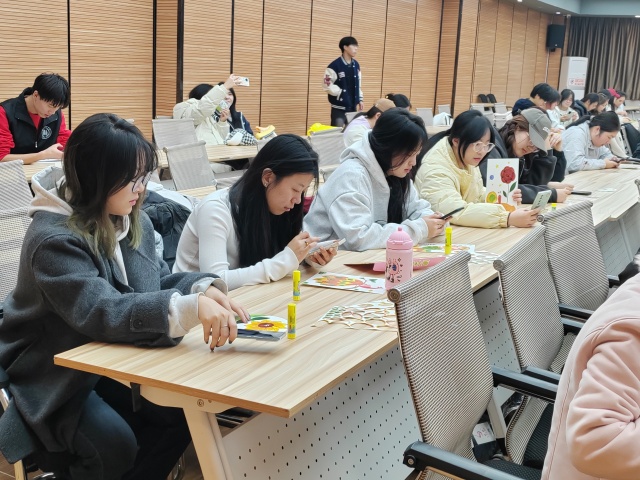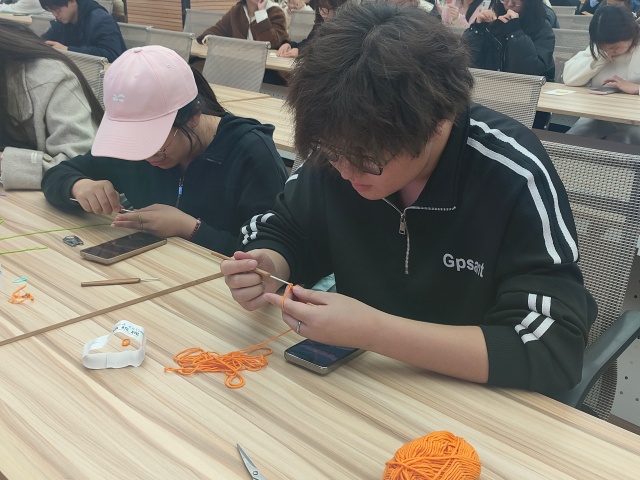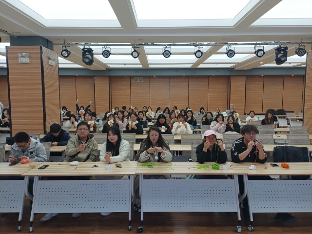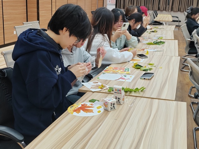 在“国潮手工·悦享秋日”的班级实践活动中,同学们积极投入,开展了各具特色的手工创作。有的同学使用落叶套装、养生卡片,创作落叶明信片并书写养生知识,让一片片落叶变成传递养生智慧的载体,打造出一幅幅精美且富有文化内涵的作品;有的同学借助毛线织针、胶带等工具,编织毛线杯垫/手环或制作落叶花束,大家一边编织制作一边交流,现场欢声笑语不断,一件件手工作品在同学们的巧手下诞生;还有的同学利用落叶装饰画,充分发挥创意创作了各种生动造型,展现出独特的艺术创造力。期间,辅导员宿宇老师还亲身指导同学们的创意表达,鼓励大家大胆创新。活动最后,大家进行成品展示,同学们互相欣赏、交流,分享着制作过程中的乐趣和收获。
