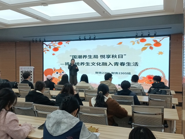 四季俱可喜,最好新秋时。在这万物收获、养生调适的黄金季节里,随着“国潮”文化的蔚然兴起,传统养生理念与现代生活方式的巧妙融合,已成为青年群体瞩目的新风尚。大学生正值身心发展的关键阶段,面对学业、社交等多重压力,亟需科学、有效的健康管理方式。为此,淬炼·国际商学院财务管理2301班 - 2305班于10月22日17:00—18:00在多功能报告厅,精心策划了一场以“国潮养生局 悦享秋日”为主题的专题活动。这场活动不仅是一场健康知识的盛宴,更是一次传统文化的青春演绎,旨在引导同学们在秋日的温馨氛围中,感受传统文化的深厚魅力,树立科学的健康观念,以更加积极、饱满的姿态拥抱生活。