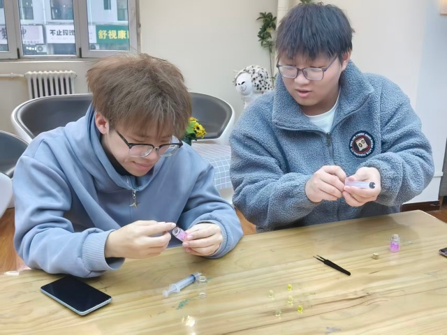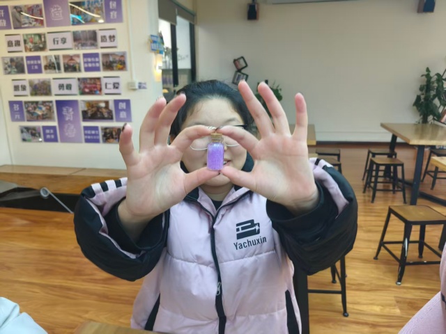 活动接近尾声时,同学们纷纷拿起自己的作品拍照留念,有的举着许愿瓶对着阳光,让晶莹的水宝宝折射出绚烂的光芒;有的和朋友一起捧着许愿瓶合影,记录下这份共同的美好回忆。这个许愿瓶虽然小巧,但里面装着同学们的小心愿。