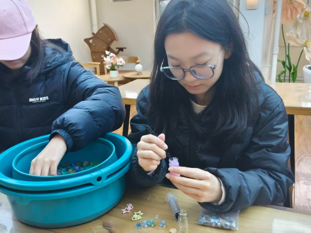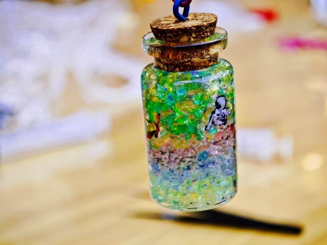 同学们围坐在桌前,手持镊子,小心翼翼地将水宝宝一颗一颗放入玻璃瓶中,有的按颜色分层排列,打造出渐变的“彩虹效果”;有的混合不同颜色的颗粒,营造出梦幻的“星云感”;还有的在瓶底铺上一层闪粉,让水宝宝仿佛沉浸在“星光”之中。除了常规的颜色搭配,不少同学还加入了巧思。有的在瓶中放入小巧的干花,让许愿瓶兼具自然气息;有的在瓶口系上丝带,增添精致感;还有的在瓶身贴上自己手绘的贴纸,让作品更具个性。