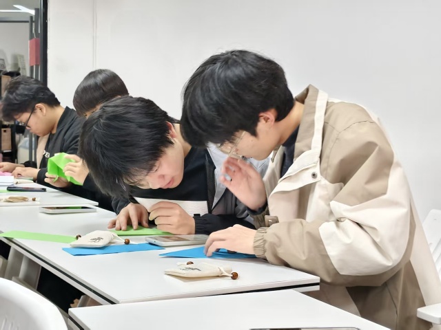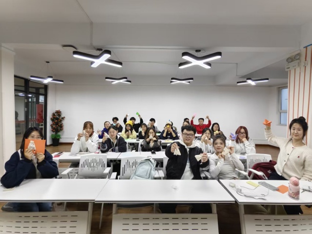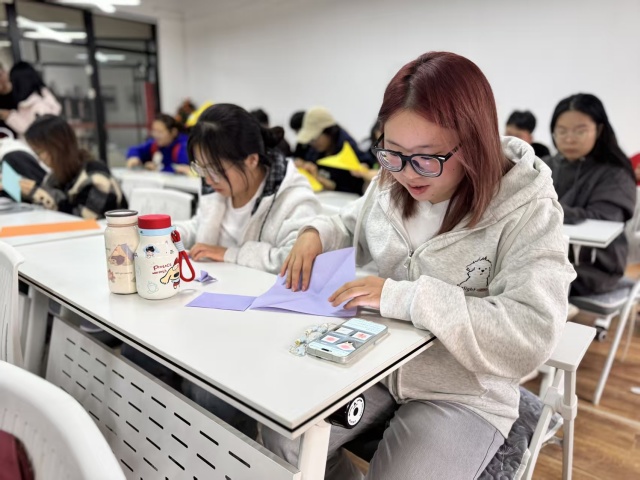 在同学们期待的目光中,茱萸折纸创作环节正式开启。大家以小组围坐,桌上摆着彩纸、剪刀等工具,在组织者的引导下,聚焦茱萸形态,围绕折纸步骤、重阳节 “佩戴茱萸辟邪祈福” 习俗讨论。经近一小时创作,彩纸经折叠、裁剪,化作形态各异的茱萸,有的简约显古韵,有的精巧见匠心,满是对传统节日文化的热爱 。
