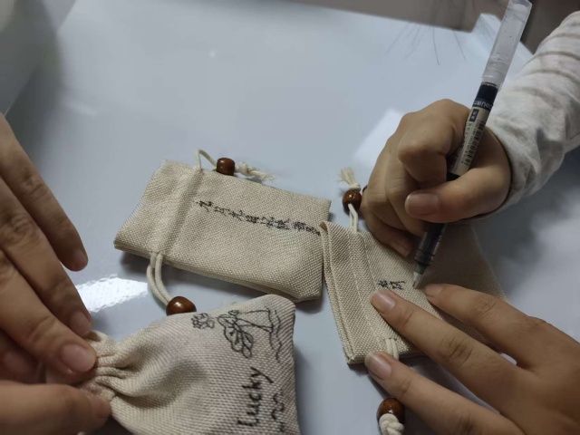 随后,温馨的茱萸花香囊制作环节开启。重阳校园里,干燥香料飘着淡香,同学们先将亲手剪的茱萸剪纸贴在香囊表面,又拿起笔在香囊上创作写字——有的写下“平安”“安康”等祝福,有的题上“岁岁重阳”等短句,再仔细装入香料密封。从剪纸点缀、提笔创作到香料填充,大家分工协作、相互帮忙,一个个兼具文化感与心意的茱萸花香囊逐渐成型。