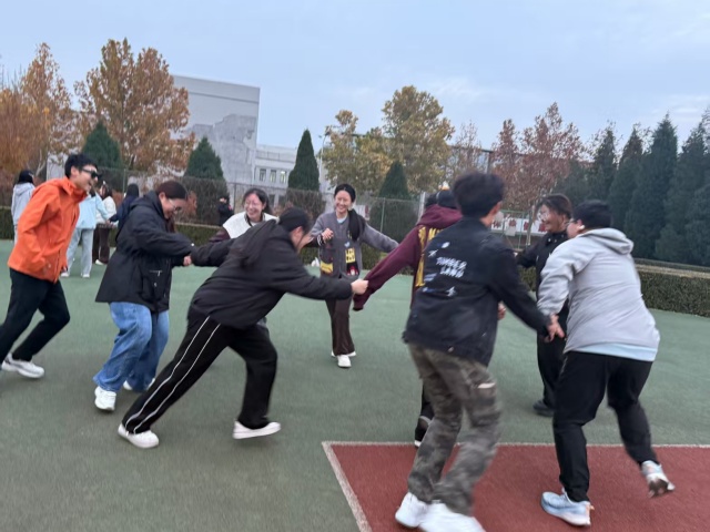 以“协作”为核,让青春“热烈绽放”。“3、2、1——游戏开始!”随着组织者的一声令下,第一操场瞬间变成了“欢乐战场”:五组同学迅速散开,每组的“初始皇上”站定中心,8名“忠臣”立刻围成圈,顺时针快步转动起来,裙摆与衣角在风里扬起轻快的弧度;而潜藏在人群中的“刺客”,则弓着身子、脚步轻移,目光紧盯着“皇上”的方向,寻找着突破“忠臣防线”的间隙。
