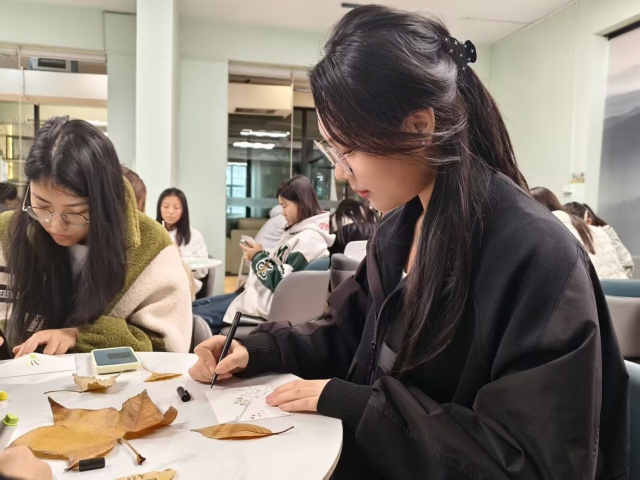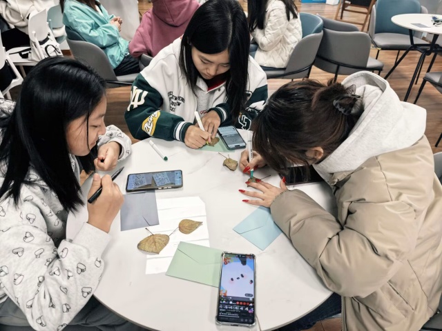 “我要把这片银杏叶送给妈妈,”坐在桌前的张舒然同学,指尖轻轻抚过叶片上清晰的纹路,眼神温柔得像盛满了星光,“她总说我离开家后,秋天就少了份念想,这下,秋天可以跟着信封回家了。”桌上那些造型各异的叶片,此刻成了秋光的容器,也盛满了少年人对往昔与未来的期待。