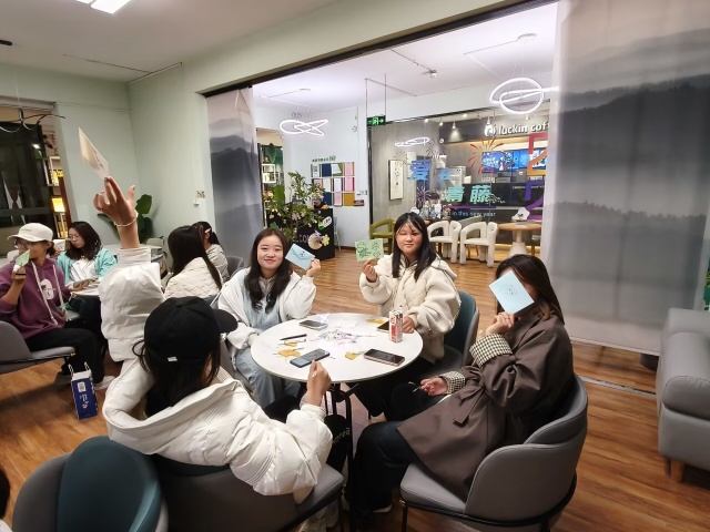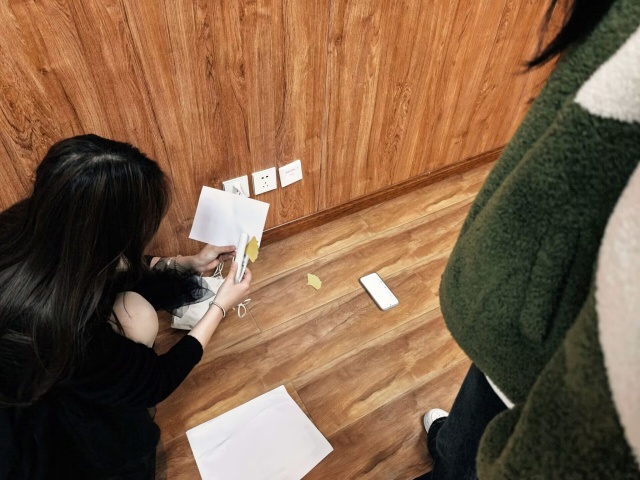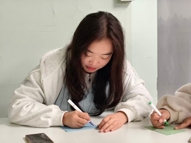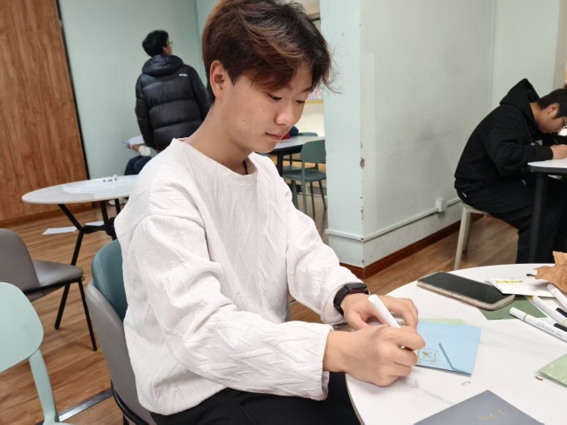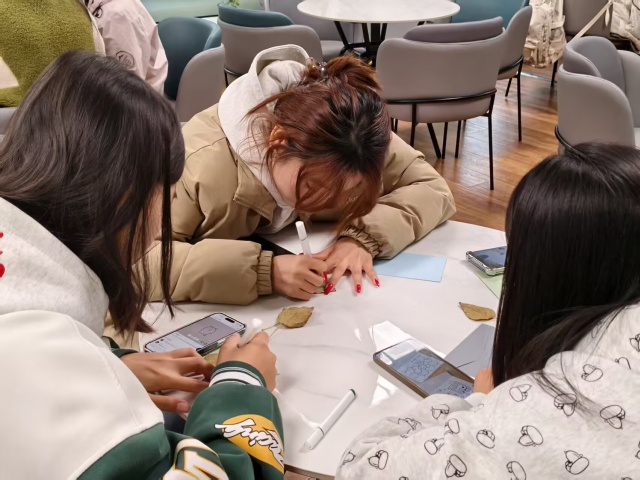 活动当天,班级被精心划分为多个小组,班委们穿梭在人群中统筹协调,技术指导握着马克笔耐心解答创作困惑,摄影师的镜头追着每一片落叶与每一次欢笑——这样的分工,让团支书张舒然看着热闹的现场,心底漾起一阵暖意:“原来一群人的浪漫,是可以这样井井有条又充满惊喜的。”