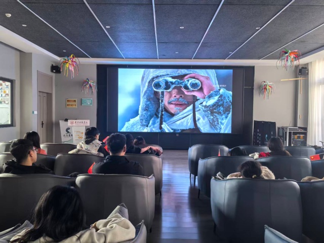 昏暗的观影室内,只有屏幕上跳动的光影照亮着同学们的脸庞。此刻,《狙击手》影片正播放到紧张的战斗场景,志愿军狙击手在雪地中潜伏,眼神锐利如鹰,每一次瞄准、每一次射击都扣人心弦。画面中,同学们或微微前倾身体,或双手紧握放在膝上,全神贯注地盯着屏幕,生怕错过任何一个细节。有的同学被影片中战士们的英勇无畏所打动,眼角泛起了泪光,却悄悄用手背拭去,不愿打破现场的沉浸氛围;有的同学则眉头紧锁,紧盯着屏幕上的战斗进展,仿佛自己也置身于那个战火纷飞的年代。当影片中出现战士们为了完成任务,不惜牺牲自己的画面时,现场响起了细微的抽泣声,更多的同学则默默攥紧了拳头,眼神中充满了对英雄的崇敬与缅怀。整个观影过程中,没有一丝嘈杂,只有影片中的枪炮声、呐喊声与同学们偶尔的叹息声交织,大家在光影的洗礼中,深刻感悟着志愿军战士的革命精神与家国情怀。