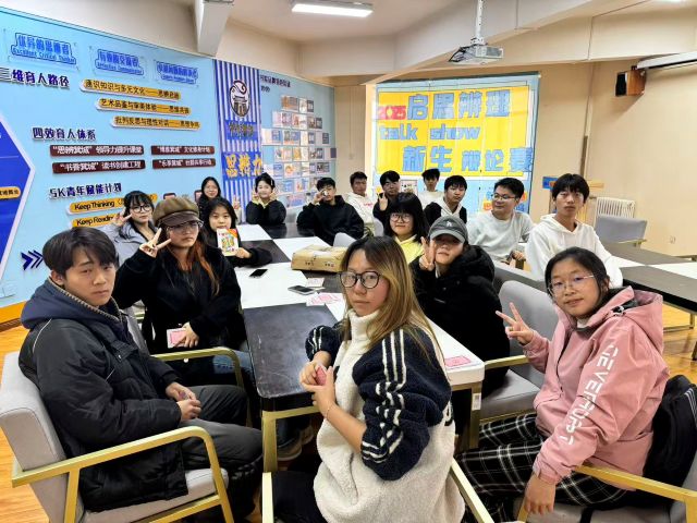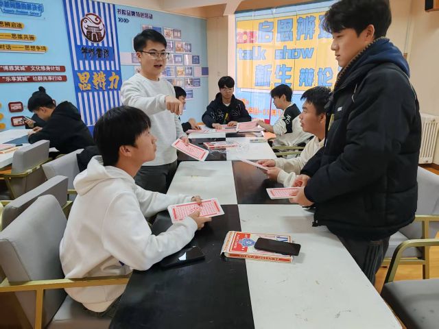 游戏刚开局,抽到“班徽牌”的同学红着脸站起来,大声喊出“经管2402,创意不打烊”的班级口号,原本分散的小团体瞬间齐声应和,陌生感在口号声中消解大半;当有同学抽到“昵称任务”时,原本腼腆的女生笑着说出队友的外号“奶茶大户”,引得全场哄笑;而“模仿班长口头禅”的环节,惟妙惟肖的语气更是让活动室里的笑声几乎掀翻屋顶。