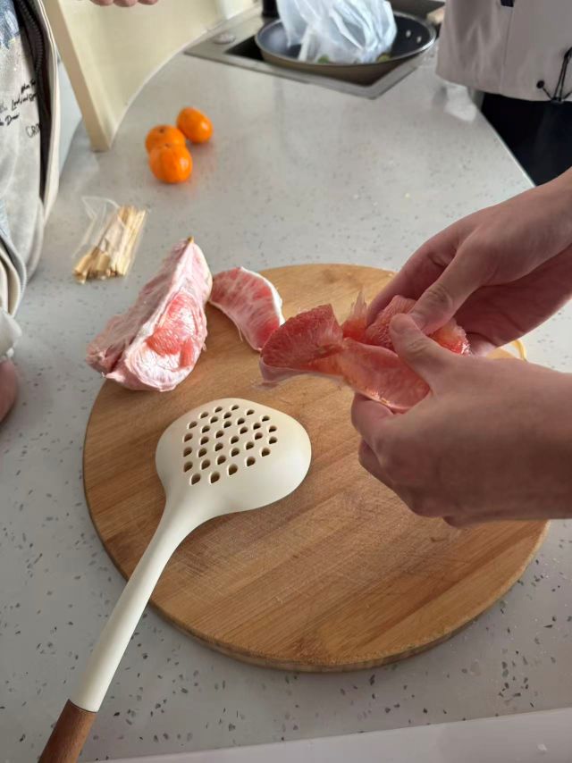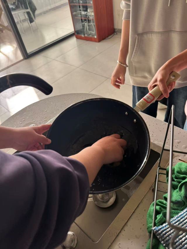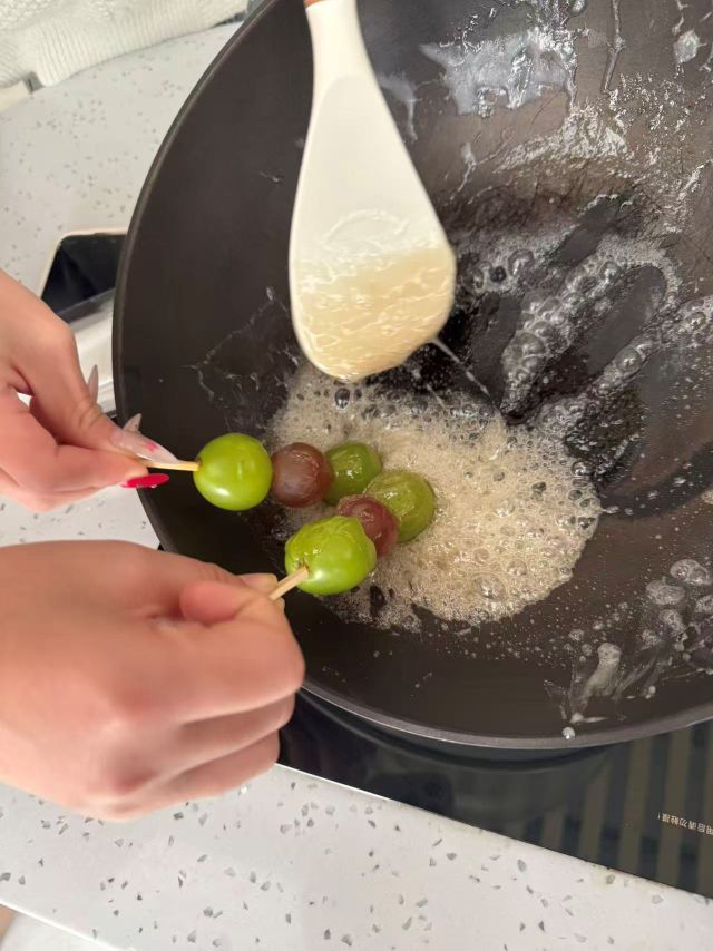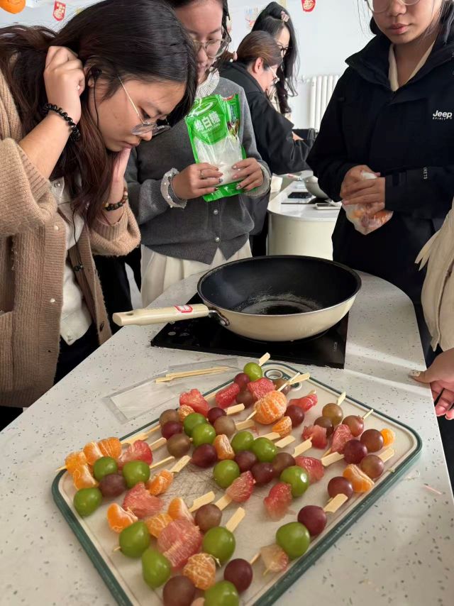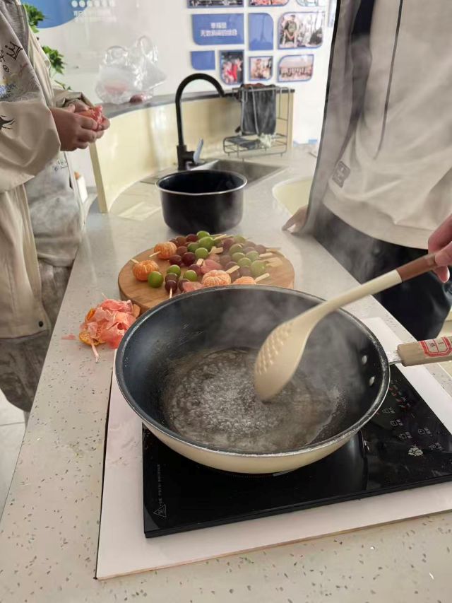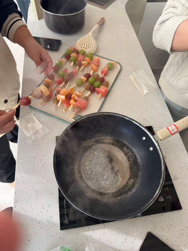 串好水果,就到了最有挑战也最有意思的熬糖裹衣环节。承办的同学提前准备了干净的铁锅,把冰糖和适量清水倒进去,炉火一加热,冰糖慢慢化开,从颗粒变成琥珀色的糖浆,锅底的气泡轻轻翻滚着,浓浓的甜香一下子就飘满了整个厨房。有经验的同学在旁边指导,大家轮流上手,小心翼翼地把串好的果串放进滚烫的糖浆里,再飞快提起来。透明的糖衣裹着饱满的水果,冷却后就形成了一层亮晶晶的糖壳,有的同学还趁着糖衣没凝固,撒上彩色的糖片或者芝麻,每一串糖葫芦都变得独一无二,看着就诱人。过程中,难免会遇到糖浆裹得太厚、水果不小心掉下来的小意外,但大家都没泄气,反而互相打气,一次次试着调整,慢慢就掌握了熬糖的火候和裹衣的技巧。当第一串成功裹好糖衣的糖葫芦做出来时,现场一下子响起了欢呼,那种成就感和开心劲儿,一看就藏不住。