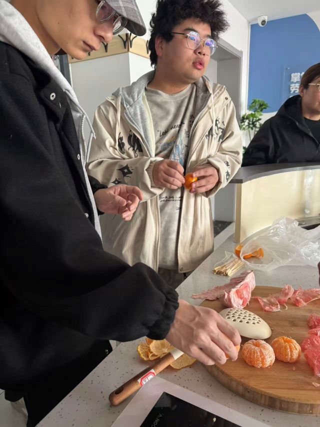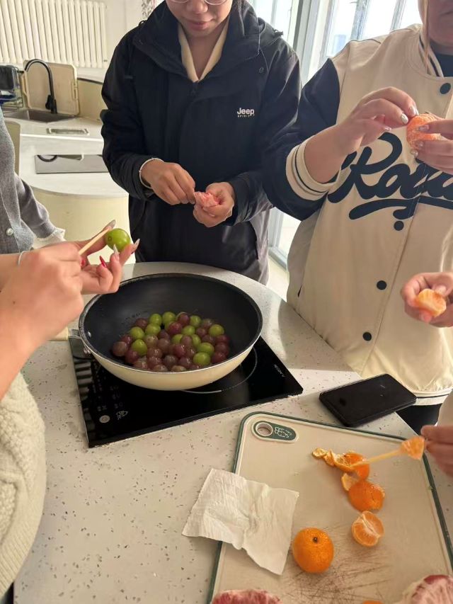 活动开始前,共享厨房早就布置妥当,食材和工具摆得整整齐齐。新鲜饱满的山楂、红得发亮的草莓、酸甜多汁的橘子、亮晶晶的青提,还有各种当季水果,都分门别类放好,竹签、冰糖、好看的装饰糖片这些东西也一样不缺。15点一到,暖乎乎的灯光亮起来,活动正式拉开序幕。大家按顺序领好食材,马上就投入到构思和串制中。没有固定的样式要遵守,每个人都放开了想象力:有人就爱颜色搭配得舒服,把红草莓、橙橘子和绿青提挨个串起来,渐变的颜色看着就清爽;有人喜欢做可爱的造型,用山楂和小番茄拼个笑眯眯的脸蛋,或者拿葡萄当眼睛、山楂当脸颊,让小小的糖葫芦变成了萌萌的卡通形象;还有人敢尝试新花样,在水果串里加块酥脆的饼干、一团软乎乎的棉花糖,让传统的糖葫芦跳出了老样子,吃起来口感也更丰富。创作的时候,大家时不时分享想法,互相搭把手,有人教别人怎么串更稳,有人帮忙调整水果的位置,说说笑笑间,原本不太熟的距离慢慢拉近,集体的暖意就在指尖流转着。