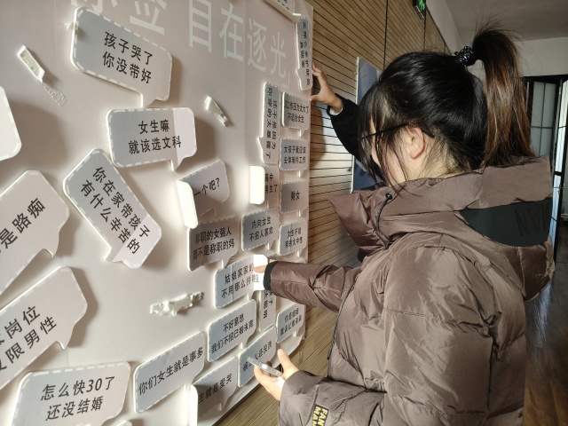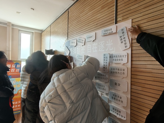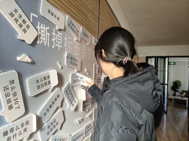 然而,平静的聆听,是为了积蓄更强大的破壳力量。讲解尾声,一场酝酿已久的“打破标签”行动正式启动!同学们涌向那面贴满刻板印象的标签墙——“乖乖女”、“女强人”、“剩女”、“为母则刚”……没有犹豫,只有此起彼伏的清脆碎裂声。同学们亲手将这些沉重的标签从墙上狠狠撕下、用力摔碎。那一刻,积蓄的能量瞬间爆发,现场宛如一场盛大的集体仪式,用最直接的方式向所有束缚说“不”!