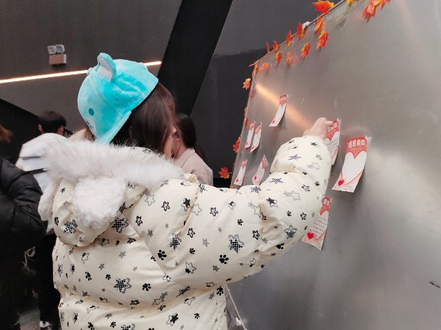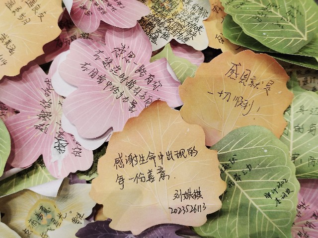 200张空白纸片瞬间变身“弹幕”,同学们纷纷把充满谢意的纸片贴在蟹蟹引力墙上:
