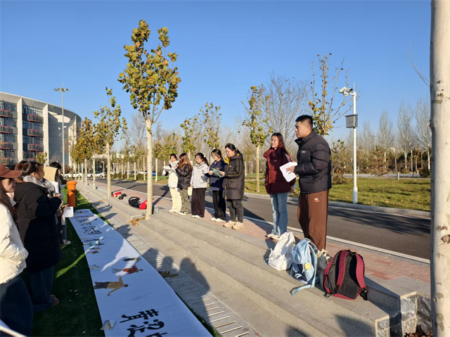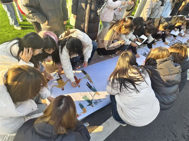 活动的尾声,仪式感再度升华。一幅题为“青春的印记,远方的序言”,副题为“青涩的回响,山海的开篇”的空白长卷在场地中央铺开。王军御老师邀请全体同学,以班级和方才站定的“未来赛道”为组,共同执笔,将对大学的构想与未来的憧憬挥洒于画卷之上。随着笔墨交织,个人的愿景与集体的蓝图相融,最终凝结成一幅充满生机与希望的壮丽图景。环节的终点,全体师生在这幅象征着彼此连接、共赴山海的画卷前合影留念,将此刻的共鸣与期盼,永恒定格为属于彼此的“青春印记”。