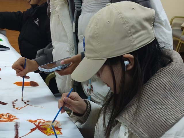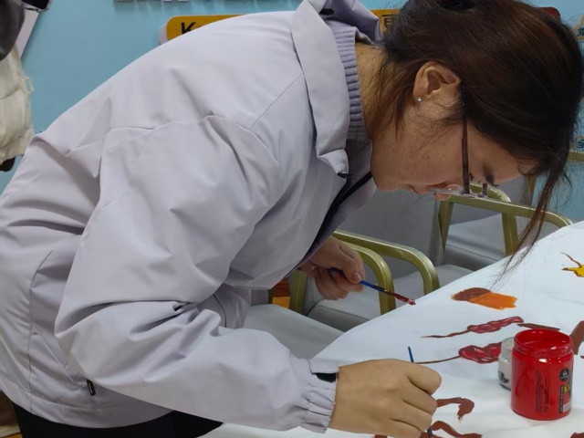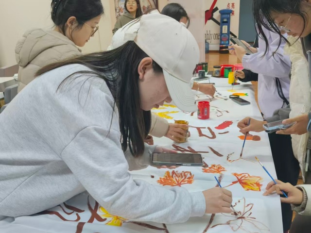 创作过程中,同学们各展所长,默契配合。有的同学功底深厚,负责勾勒苍劲的树干与大致的轮廓;有的同学心思细腻,用心点缀漫天飞舞的红叶与金黄的落叶地毯;更有同学创意十足,将枝桠上跃动的蝴蝶,巧妙地融入秋景之中。同学们不时交流心得,互相欣赏作品。“你的这个落叶的颜色调得真好看!”“看我画的这棵‘狂野派’枫树!”这样的赞叹与欢笑不绝于耳。画笔不仅涂抹着颜料,更串联起彼此的情感。画布的一角,几位同学共同画下了秋天的象征物,让它也“漫步”在这片秋色里,平添了许多趣味。