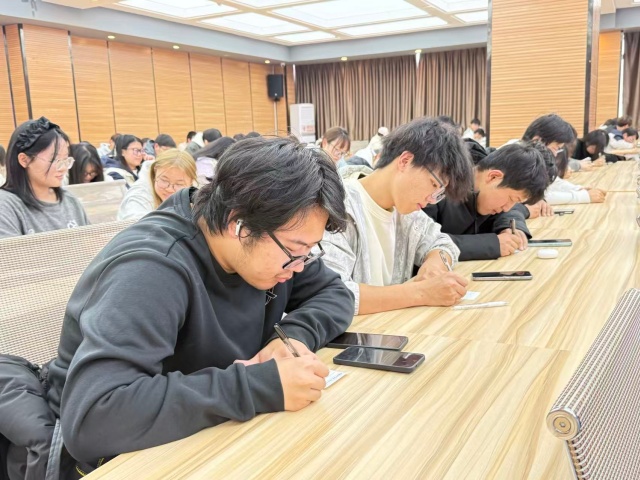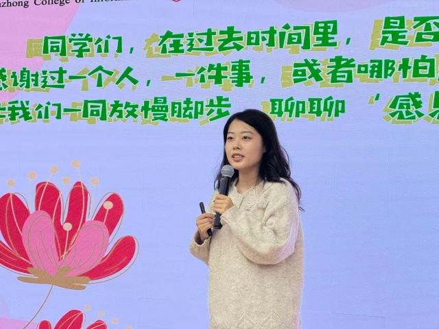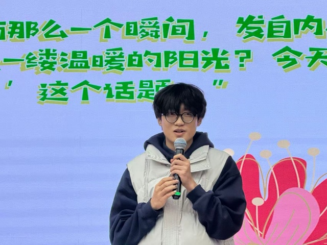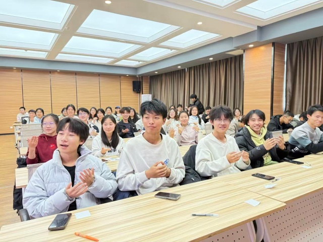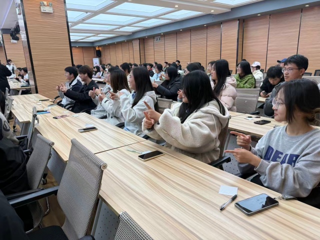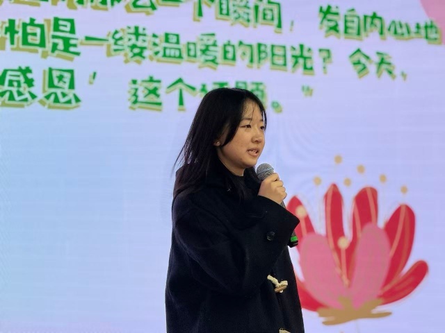 谜语互动结束后,“互动提问分享”环节接力升温。张冰璐老师围绕“成长中最难忘的感恩瞬间”“最想对身边人说的感谢话语”“如何将感恩融入日常生活”等话题发起提问,学子们纷纷举手响应,主动分享自己的故事与感悟。大家真挚的分享引发了现场学子的强烈共鸣,同学们认真倾听,现场掌声不断。通过面对面的交流,大家不仅传递了感恩之情,更汲取了彼此的温暖力量,让感恩的种子在心中深深扎根。