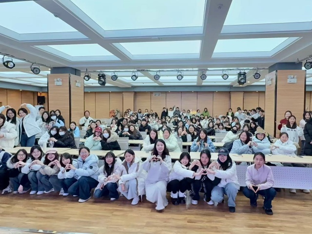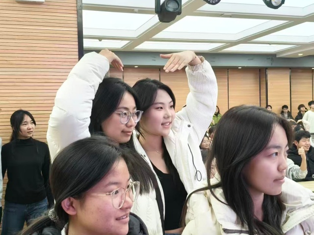 活动接近了尾声,轻快温暖的背景音乐缓缓流淌,“感恩手势舞”环节温情上线。在组织者的带领下,同学们纷纷起身,跟着屏幕上的教学视频,默契配合,指尖流转间,将心底的感恩之情化作直观的肢体表达,现场汇成一片温情涌动的海洋。同学们以整齐划一的手势、饱含深情的演绎,为本次感恩系列活动画上圆满句号。