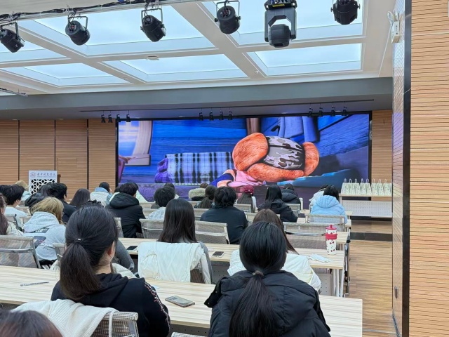 活动开始,一段精心制作的感恩暖场视频缓缓播放。视频以《熊出没》动画片中光头强感恩父母的经典片段开篇,这些细数养育之恩的画面,既充满童真趣味,又藏着最质朴的亲情羁绊,瞬间拉近了与学子们的距离。随后,视频衔接校园中的不同场景,既有展现师生情谊的暖心瞬间、食堂阿姨的备餐服务、也有青春同伴相互陪伴的成长片段。舒缓的音乐搭配真挚的画面,让现场氛围迅速沉静下来,不少学子驻足凝视,在熟悉的动画场景与强烈的情感共鸣中唤醒心底的感恩初心,为后续活动的开展奠定了温情满满的基调。