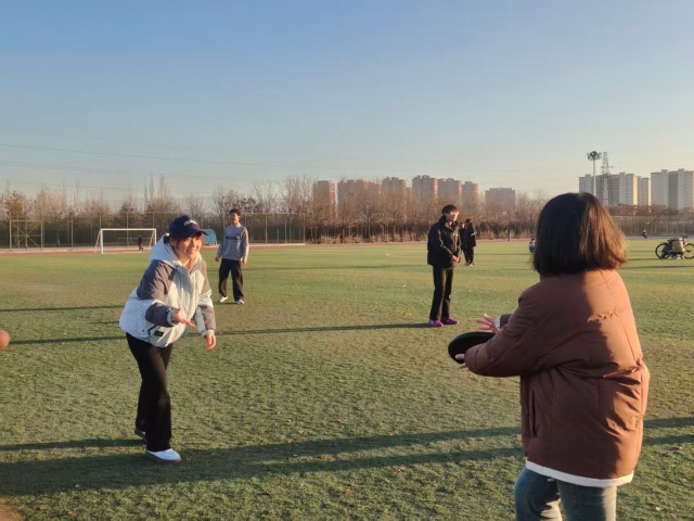 活动的核心环节——“趣味接力赛”将现场气氛推向高潮。第一棒“飞盘接力”要求队员依次传递飞盘,过程中不得落地。但很多同学没有玩过飞盘,当飞盘飞到眼前是,有的同学下意识的躲开,这时,扔飞盘的人就会着急的说“别躲呀,伸手接!”没过多久,同学们已经手眼协调、默契配合,飞盘在空中划出一道道优美的弧线,传递的不仅是器材,更是信任与协作。