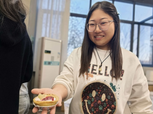 随着烤箱发出“曼妙的声音”,浓郁的奶香味“来势汹汹”令人垂涎欲滴。金黄酥脆的外皮,嫩滑香甜的内陷,刚出炉的蛋挞备受同学们的追捧,居然还有“美食博主”带了水果、饼干等来装饰,真不愧是“内行人”!在装饰的过程中,大家的热情又被推到了新的“高峰”,水果蛋挞、奥利奥蛋挞、珍珠蛋挞等新鲜出炉,大家一边品尝自己亲手制作的美味,一边分享制作过程中的乐趣,大家互相欣赏对方的创意,在不知不觉中,大家的关系又拉近了,小小的蛋挞也成为了连接彼此情感的甜蜜纽带。